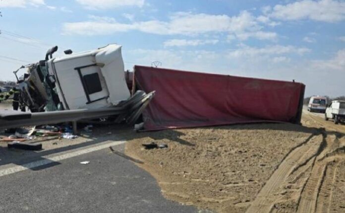 Potrivit Centrului Infotrafic din cadrul Poliției Române, șoferul autocamionului a pierdut controlul direcției, a lovit glisiera mediană și s-a răsturnat pe carosabil.