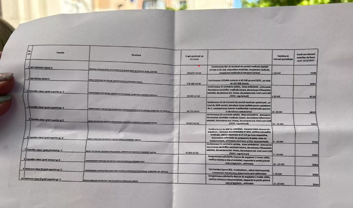 Protestatarii care au ieșit luni dimineață în fața Casei Naționale de Asigurări de Sănătate au prezentat presei un tabel cu salariile angajaților – cuprinse, în general, între sume peste 3.000 de lei net și peste 5.000 de lei net.