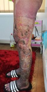 Lui Berni i s-a mai recomandat să se ungă cu „cremă de gălbenele și cu gel siliconic”, panacee universale care ajută doar în cazul în care te-ai opărit un pic și nu vrei să arăți ciudățel la plajă, cu pata aceea de 3 centimetri pe piele. Berni, în schimb, are peste 40% din suprafața corpului arsă profund (în poze se văd doar picioarele de dragul discreției), grefe de piele care vor deveni hipertrofice fără tratament și infecții de care va scăpa cu greu. La 5 ani de la Colectiv, răniților li se recomandă după externarea cu plăgi deschise…tot crema de gălbenele și dușurile făcute de cei dragi, deveniți peste noapte specialiști în igiena arsurii.