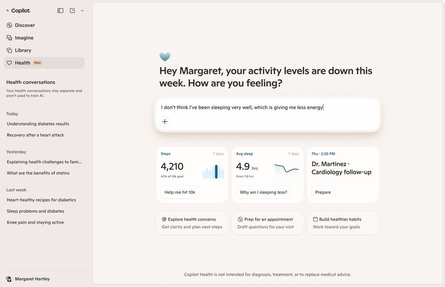Copilot Health este un „spaţiu separat şi sigur” în care utilizatorii pot pune întrebări legate de rezultatele în înregistrările medicale personale, spune compania.