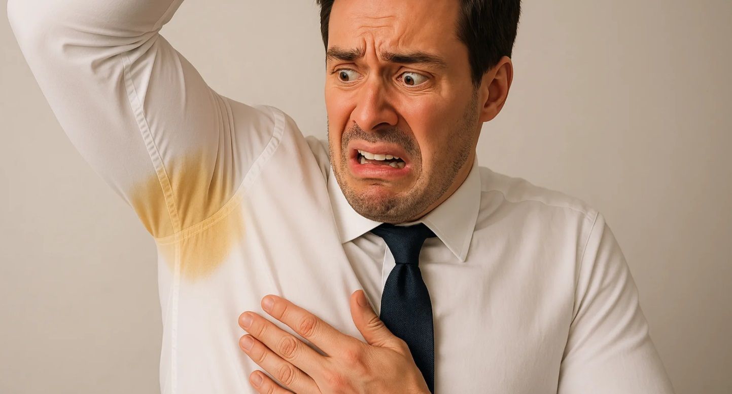 Hai să lămurim: transpirația în sine este incoloră. Vinovatul real este reacția chimică dintre sărurile de aluminiu din deodorant și proteinele din transpirație. Acestea pătrund în fibrele țesăturii și creează pete galbene persistente. Mai rău, cu fiecare spălare, mai ales în apă caldă și cu detergenți agresivi, compușii se fixează și mai adânc în material.