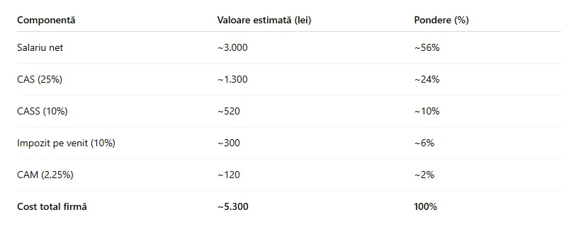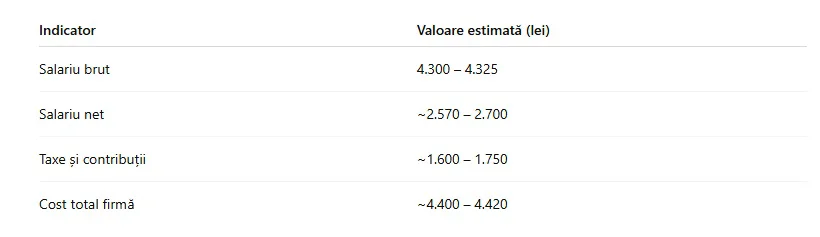 În același timp, costul total suportat de angajator ajunge la aproximativ 4.400 – 4.420 de lei. Diferența dintre salariul net și costul total este, astfel, de aproximativ 1.700 de lei.