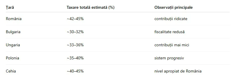 Comparativ cu alte state din Europa de Est, taxarea muncii în România se situează la un nivel relativ ridicat, în special din perspectiva contribuțiilor sociale. Deși impozitul pe venit este competitiv, nivelul total al taxării depășește, în multe cazuri, cel din alte economii din regiune.