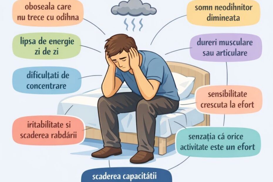 Cunoscut medical ca encefalomielită mialgică, acest sindrom se manifestă printr-o oboseală profundă și persistentă. Pacienții descriu frecvent dificultăți de concentrare, tulburări de memorie, insomnie și senzația de „ceață mentală”. Pot apărea dureri musculare, articulare, dureri de cap și simptome asemănătoare gripei. Diagnosticul este complex și necesită evaluare de specialitate.