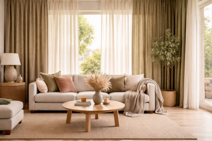 Paleta cromatică pentru perdele în 2026 include tonuri calme și naturale. Bejul cald, nuanțele de nisip, verdele măsliniu sau tonurile delicate de maro sunt printre cele mai folosite culori.
