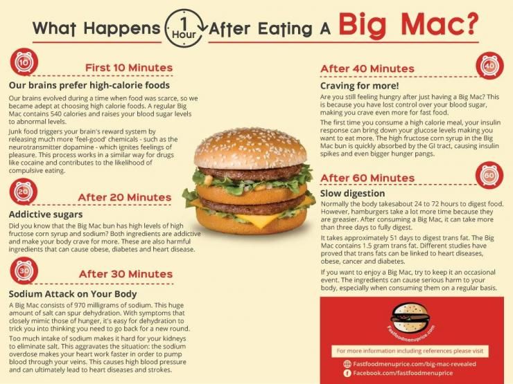 Mâncarea de tip fast-food este ușor accesibilă, intens palatabilă și concepută pentru a stimula rapid senzația de plăcere. Big Mac-ul, produs emblematic al McDonald’s, este adesea folosit ca exemplu atunci când se discută despre impactul alimentelor ultra-procesate asupra organismului. În ultimii ani, infograficele virale au susținut că un Big Mac ar avea efecte dramatice asupra corpului în decurs de o oră și că digestia sa ar dura până la trei zile.