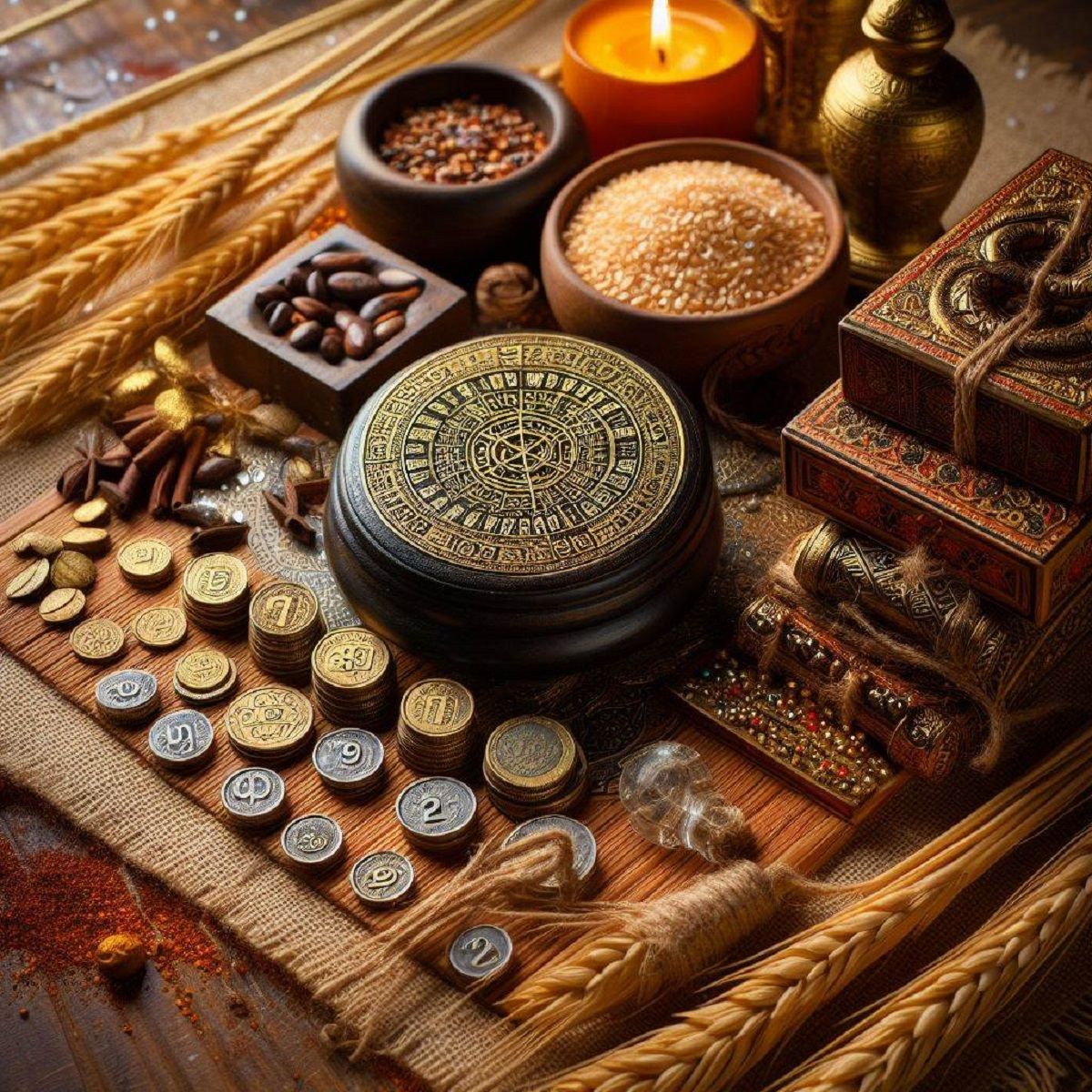 Veți avea nevoie de orez, linte turcească, năut, orz, grâu, fasole și porumb, precum și de 7 monede aurii, un pahar transparent, o panglică aurie, una roșie și una galbenă.