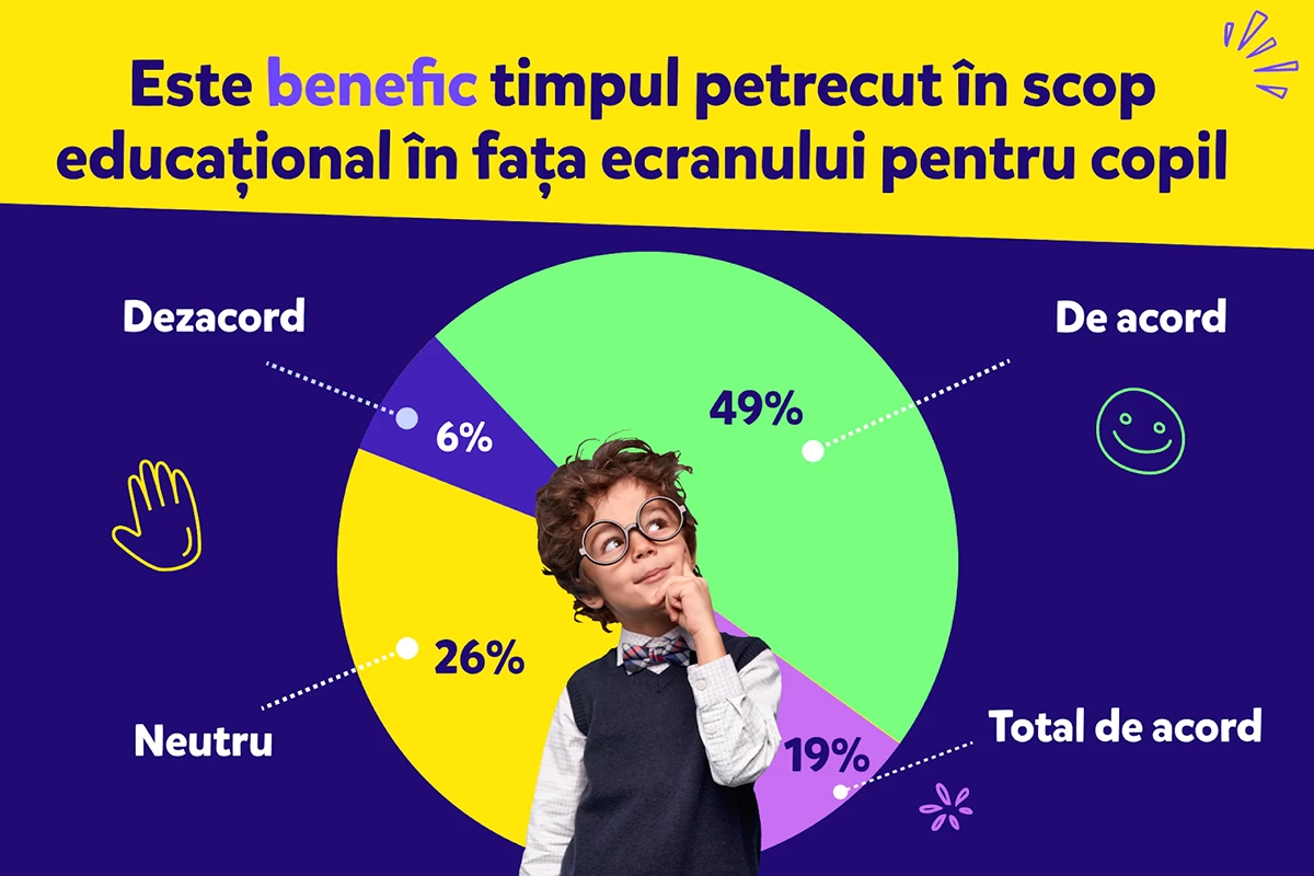Și totuși 68% dintre participanții la sondaj spun că timpul petrecut în fața ecranelor în scopuri educaționale este benefic pentru procesul de învățare al copilului, având multe efecte pozitive.